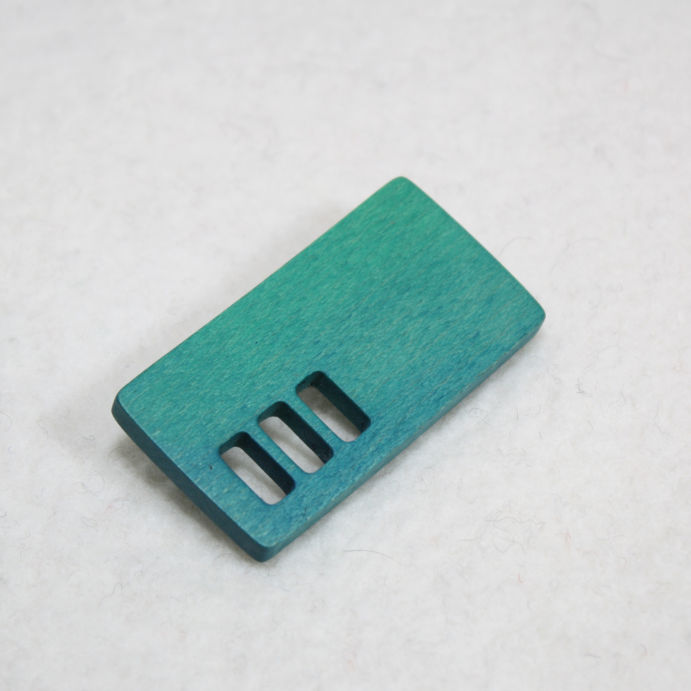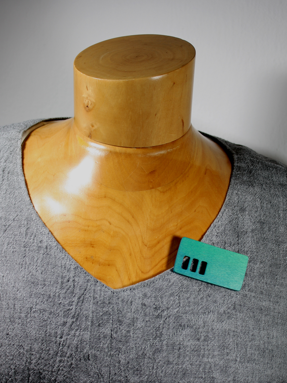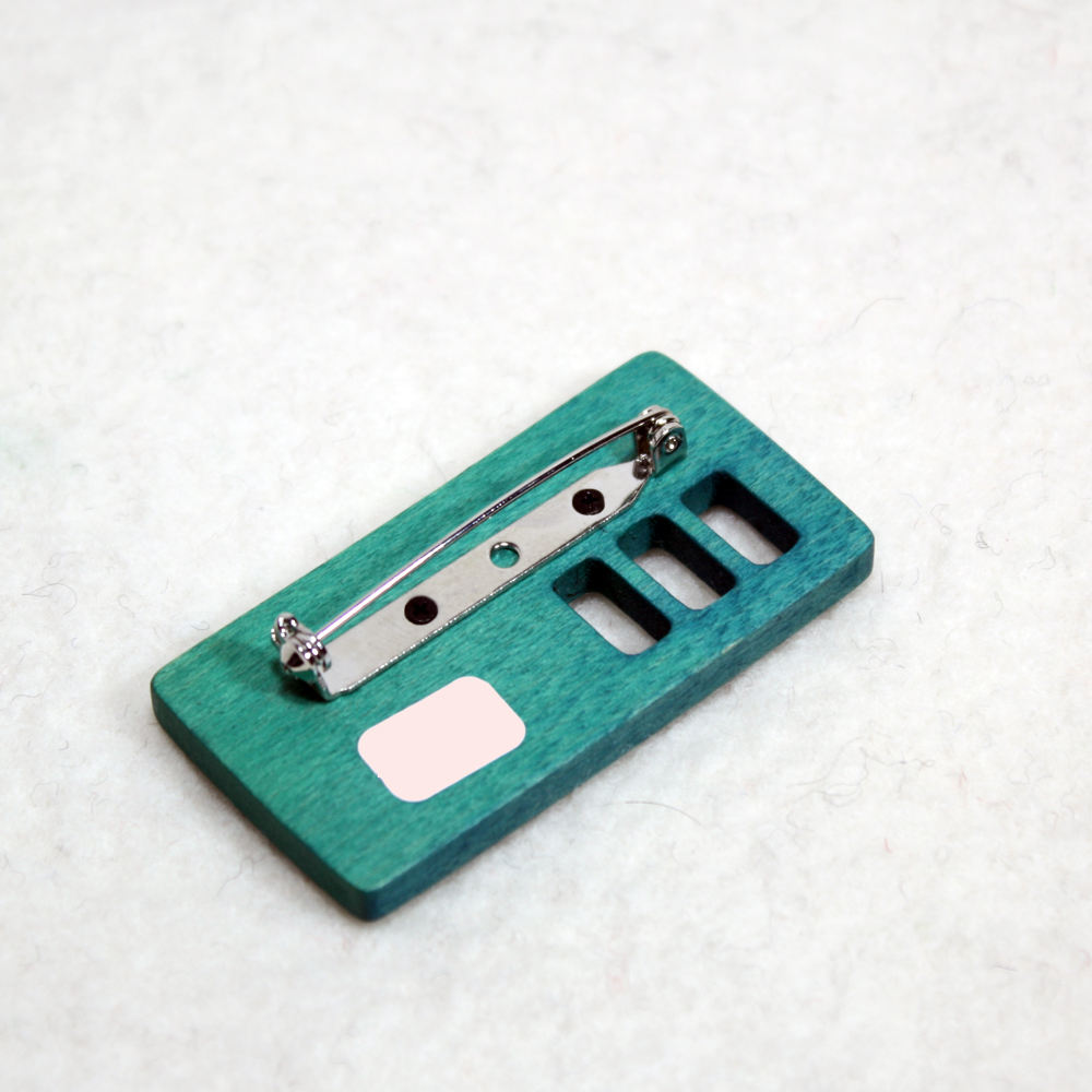 Anstecknadel auf dem Holz fest geschraubt und verriegelbar.