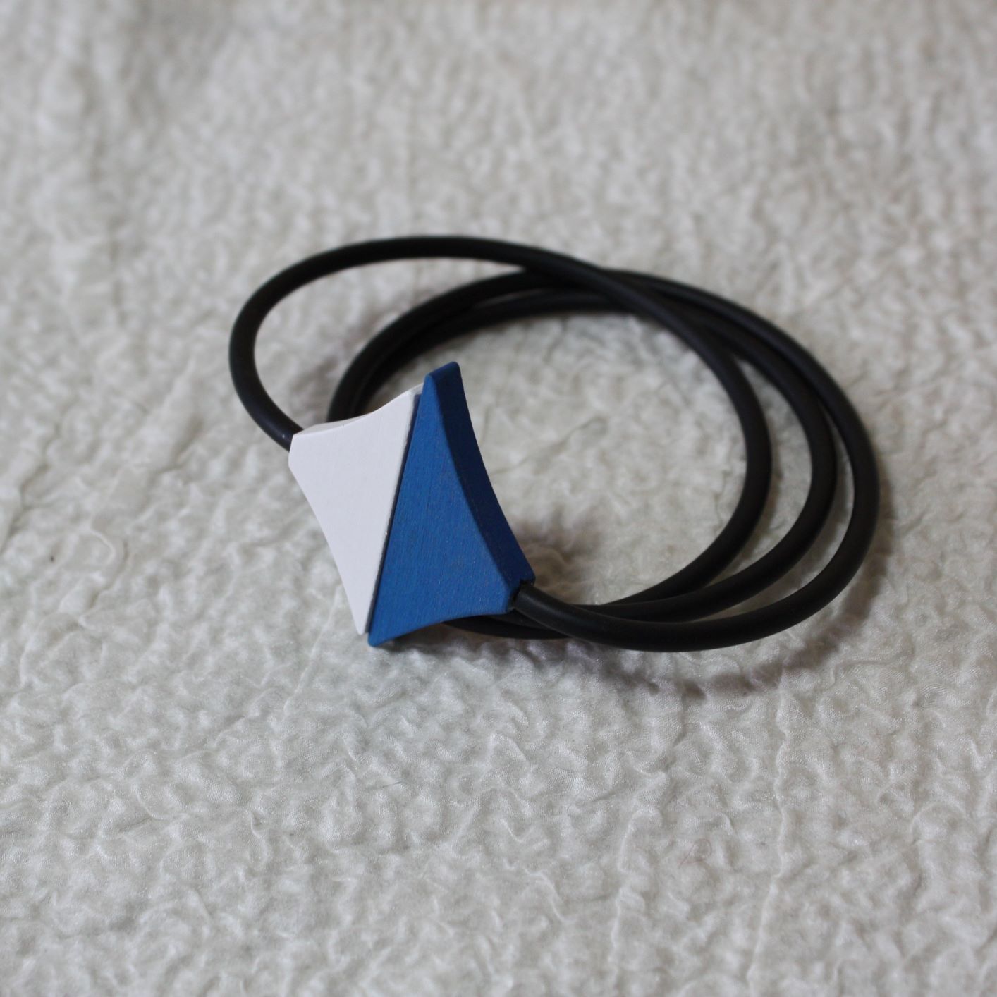 Schmuck fürs Armgelenk als perfekte Ergänzung der Kollektion. Die beiden Teile aus handbemaltem Ahorn in aufeinander abgestimmten Farben ergänzen sich zu einer Form.Hier sind Magnete versteckt, die das Armband verscließen, was man leicht mit einer Hand bewerkstelligen kann: das Kautschukband um den Arm wickeln und die Magnete zueinander bringen- flutsch!