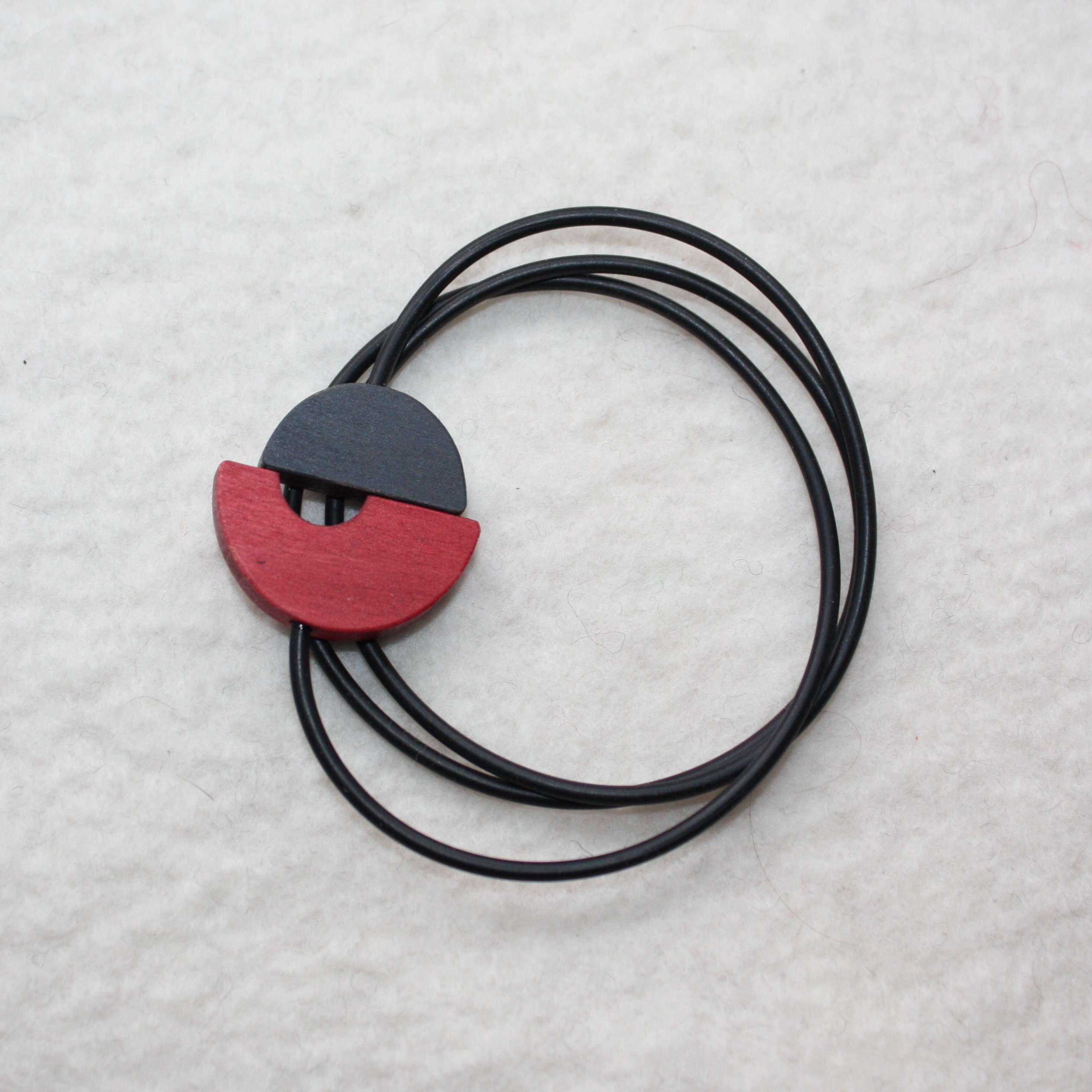 Schmuck fürs Armgelenk als perfekte Ergänzung der Kollektion. Die beiden Teile aus handbemaltem Ahorn in aufeinander abgestimmten Farben ergänzen sich zu einer Form.Hier sind Magnete versteckt, die das Armband verscließen, was man leicht mit einer Hand bewerkstelligen kann: das Kautschukband um den Arm wickeln und die Magnete zueinander bringen- flutsch!
