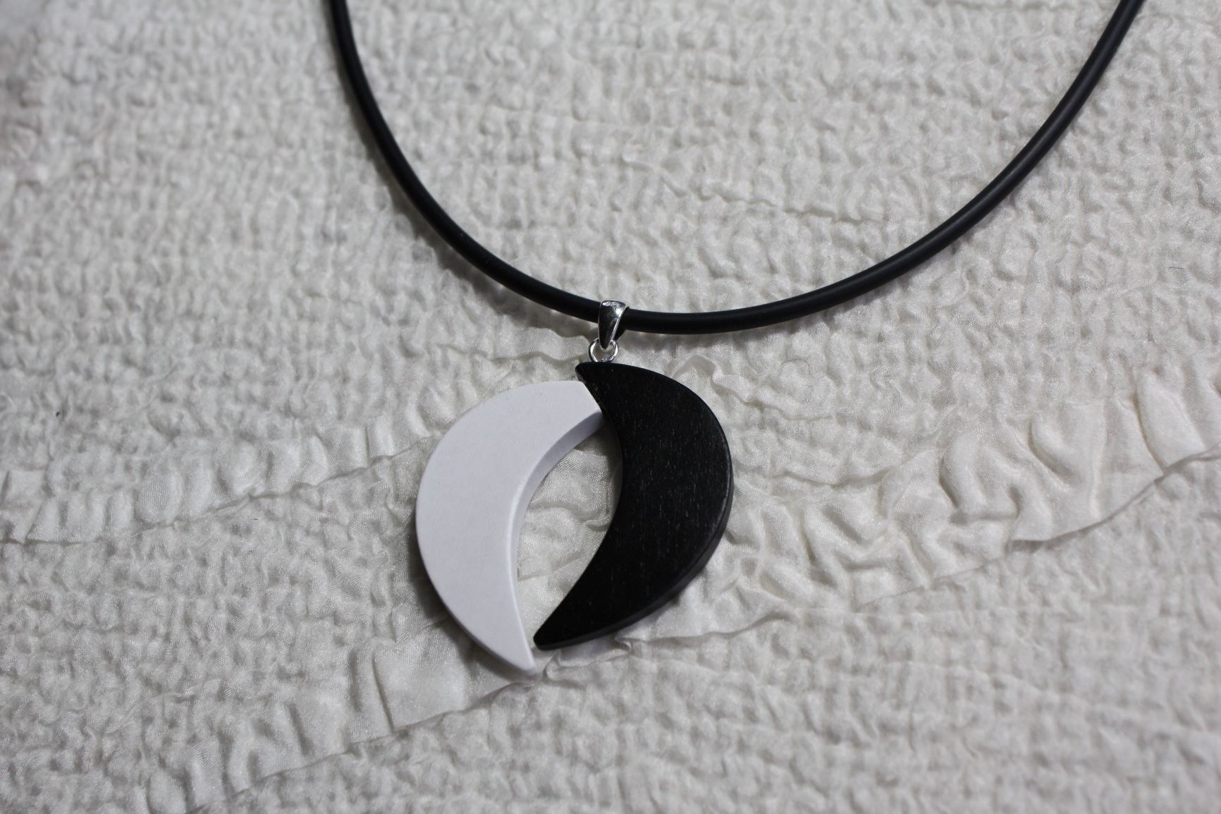 Das ist eine ausgefallene Variante mit 2 geschwungenen Holzteilen, die außerdem einen schönen Schliff bekommen haben. Mit Silberöse, so lässt sich der Anhänger mit einem Lederband auch zu einer langen Kette umfunktionieren (nicht enthalten, bitte nachfragen)