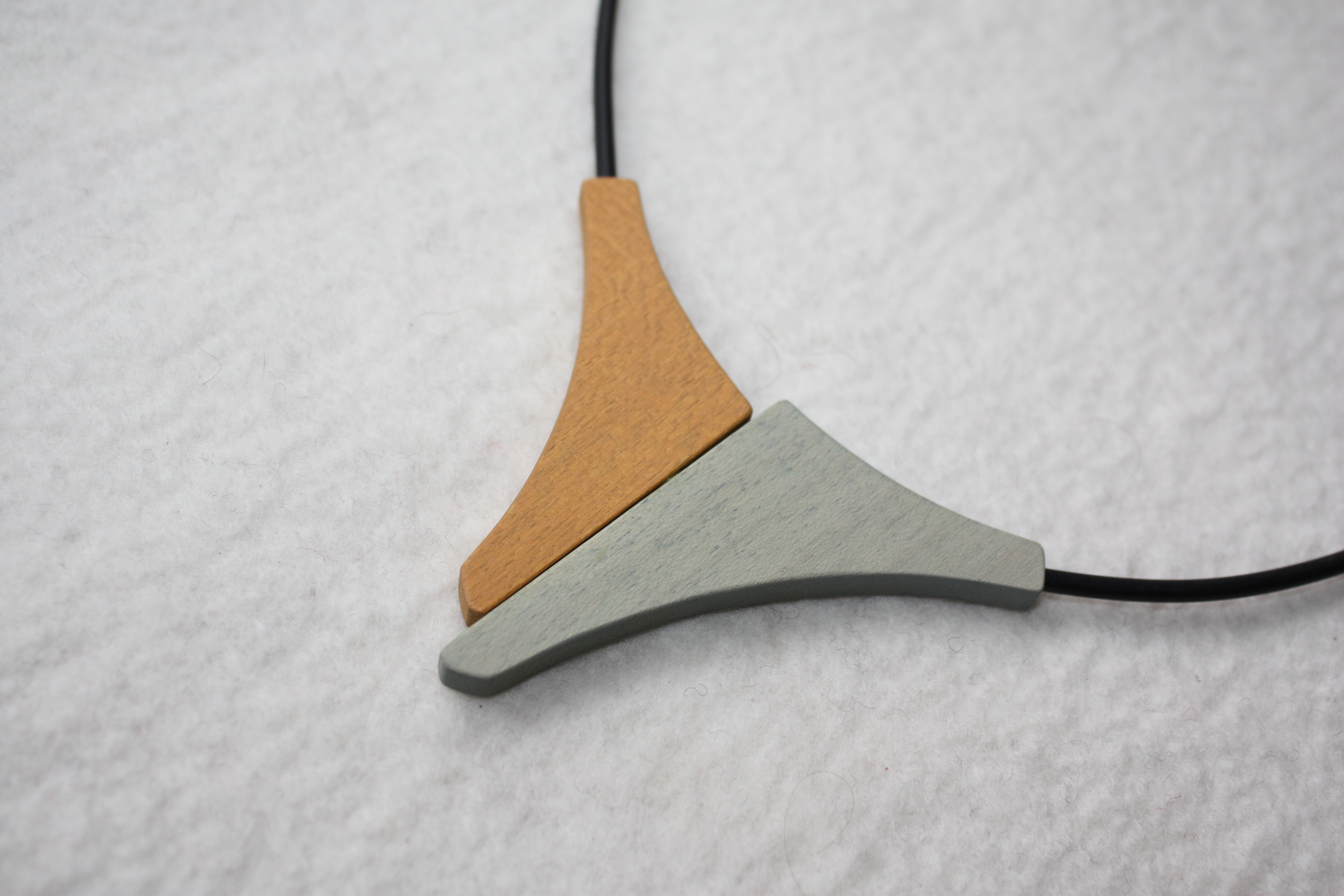 Eine schlicht geometrische kurze Kette, die es in sich hat: Magneten in den handbemalten Teilen aus Ahornholz schließen das Collier vorne. Keine Verrenkungen im Nacken mehr und kein Metallkontakt! Alleriker von Metallen müssen nicht auf dieses schöne Teil verzichten. Die Farben der beiden Holzteile sind sorgsam aufeinander abgestimmt. Eher rustikal mit dem 3mm starken Kautschukband. Eine Reminiszenz an das Bauhaus.