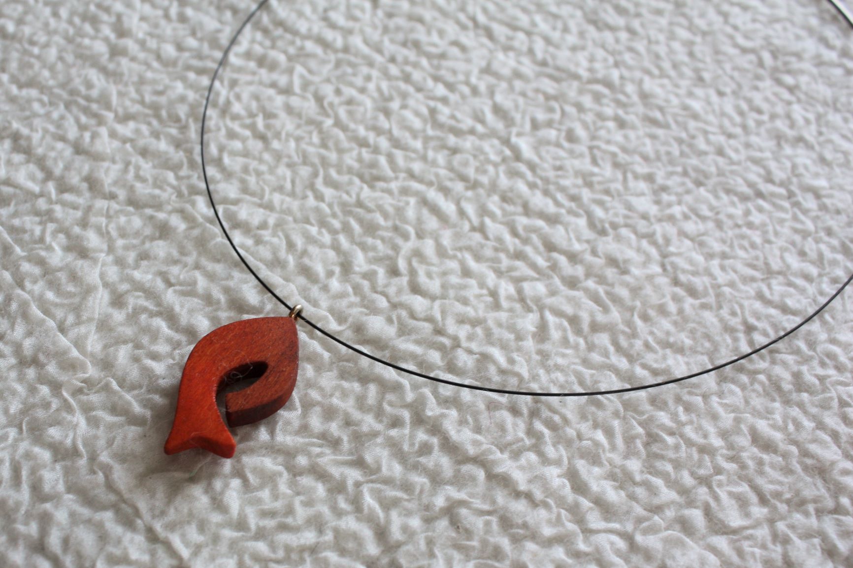 Der kleine Fischanhänger ist etwas gewölbt geschliffen ganz leicht. Ein Steckverschluss am schwarz ummantelten Edelstahldraht bringt schön zart Farbe an den Hals.