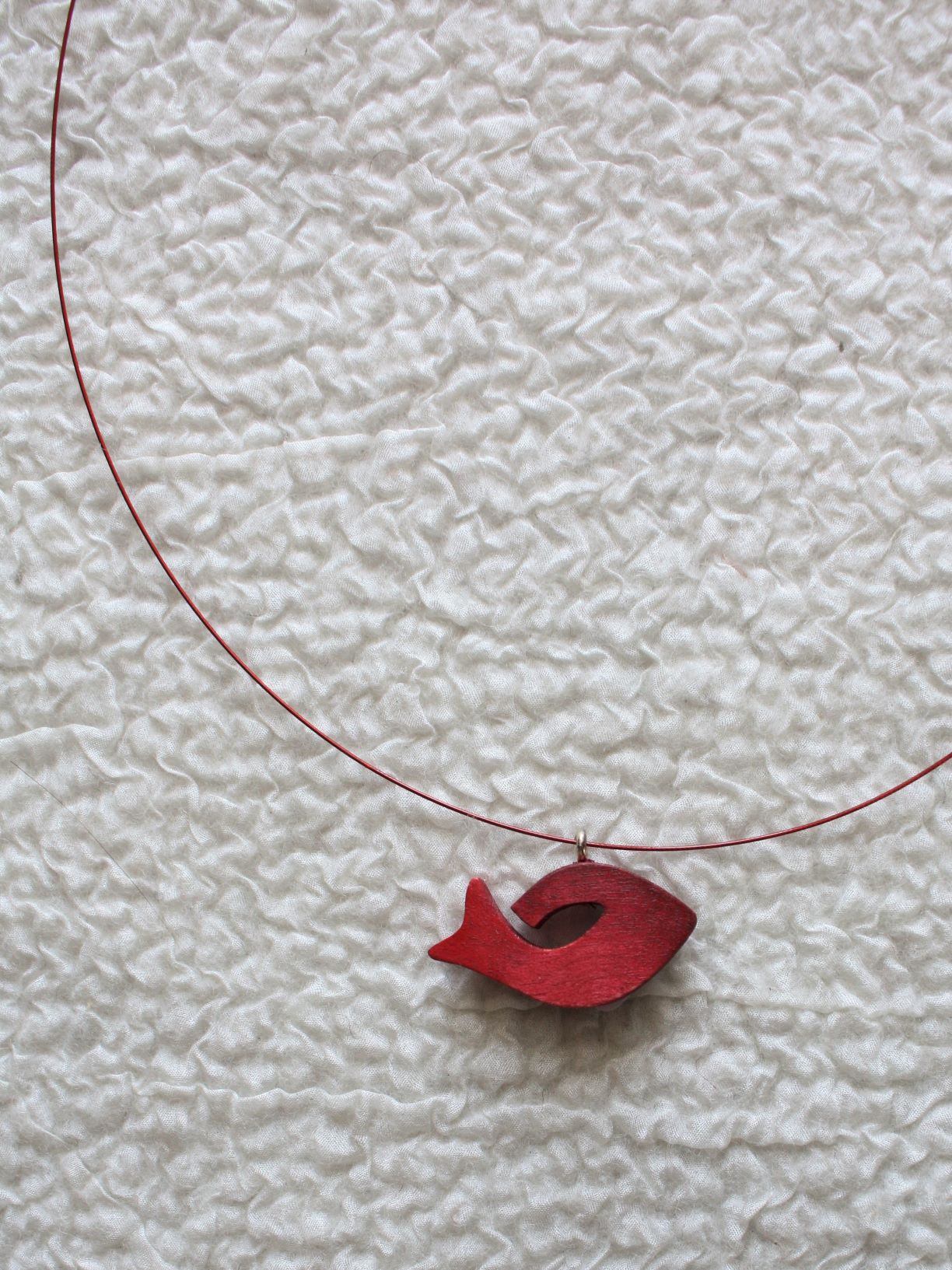 Der kleine Fischanhänger ist etwas gewölbt geschliffen ganz leicht. Ein Steckverschluss am rot ummantelten Edelstahldraht bringt schön zart Farbe an den Hals.