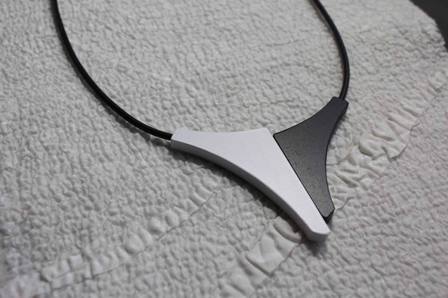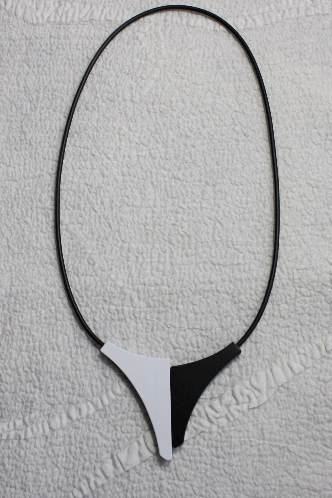 Eine schlicht geometrische kurze Kette, die es in sich hat: Magneten in den handbemalten Teilen aus Ahornholz schließen das Collier vorne. Keine Verrenkungen im Nacken mehr und kein Metallkontakt! Alleriker von Metallen müssen nicht auf dieses schöne Teil verzichten. Die Farben der beiden Holzteile sind sorgsam aufeinander abgestimmt. Eher rustikal mit dem 3mm starken Kautschukband. Eine Reminiszenz an das Bauhaus.